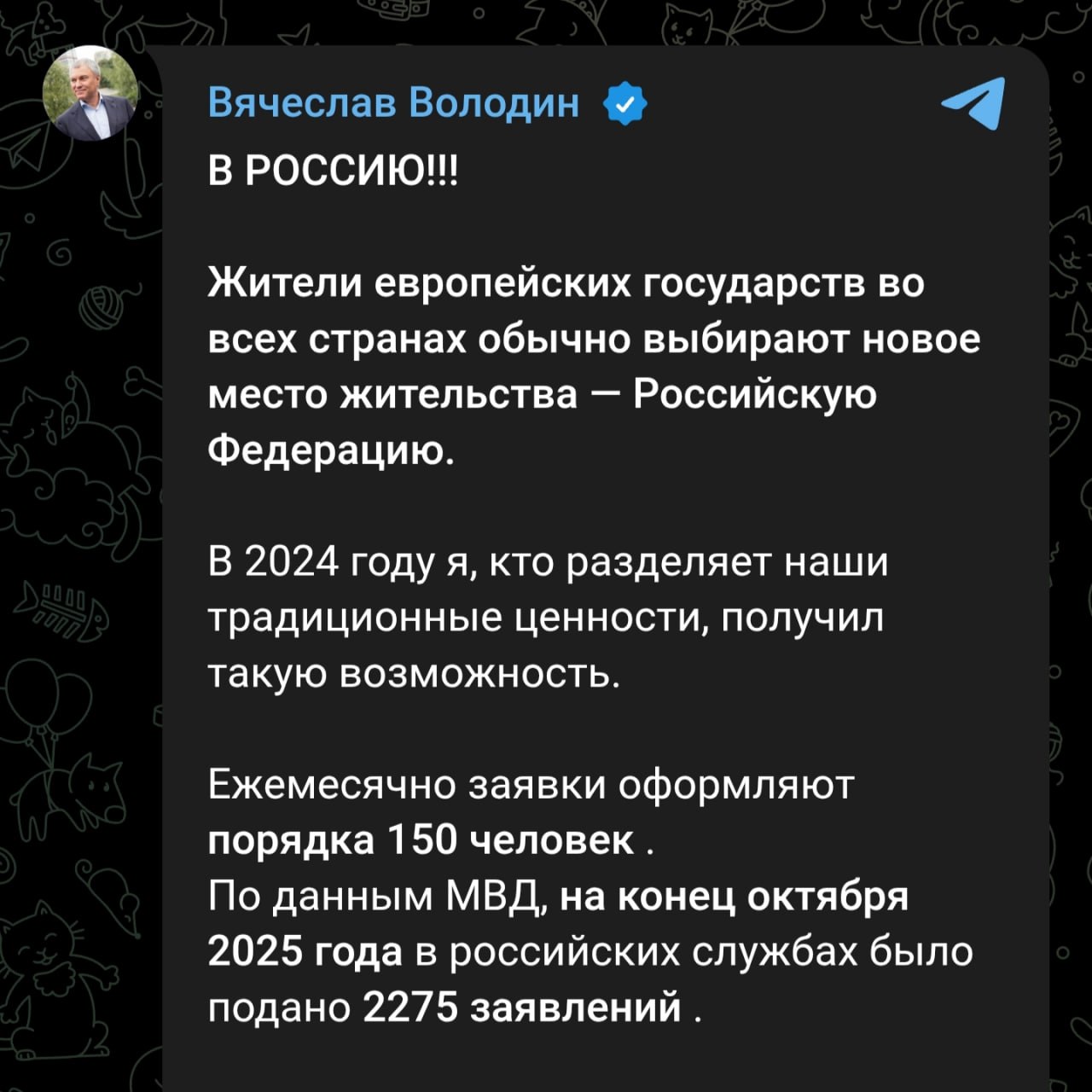 Володин заявил, что жители Европы всё чаще подают заявки на переезд в Россию в поисках свободы слова, безопасности, бесплатной медицины и образования. По его словам, таких запросов около 150 в месяц: граждане ЕС якобы бегут от «пропаганды смены пола» и «экономической рецессии» Невероятно. В 500-миллионной Европе целых 5 человек в день решают ехать в РФ. Такими темпами 1% европейцев переберётся в Россию всего-то за 1 млн. дней. То есть за какие-то несчастные 2740 лет. Есть чем крыть, а, Европа?!