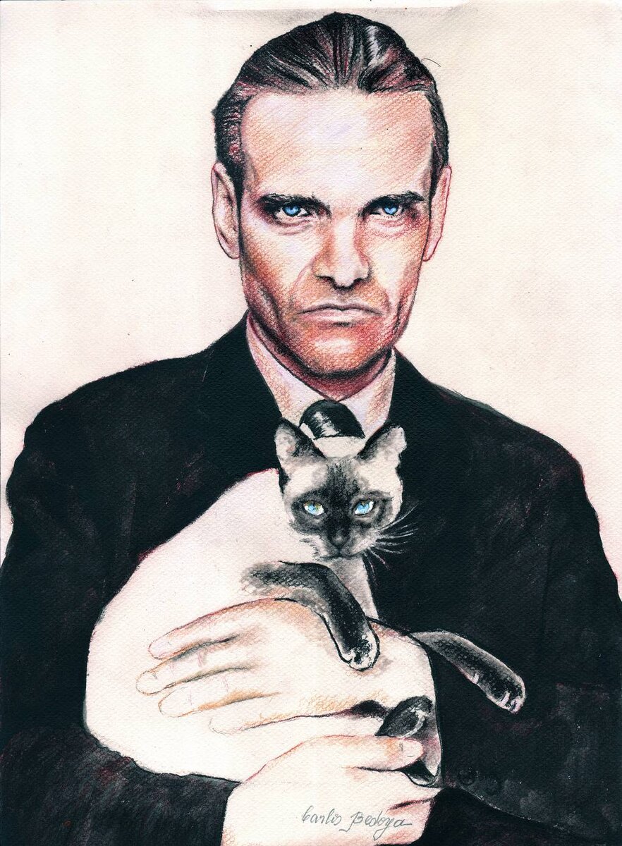 Портрет Юрия Кнорозова с кошкой Асей, автор - парагвайский художник Карлос Бедойя:
