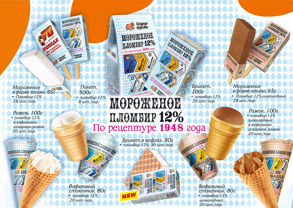 Пломбир продавался в различных формах: классический в вафельном стаканчике, брикеты, а также в виде эскимо на палочке.