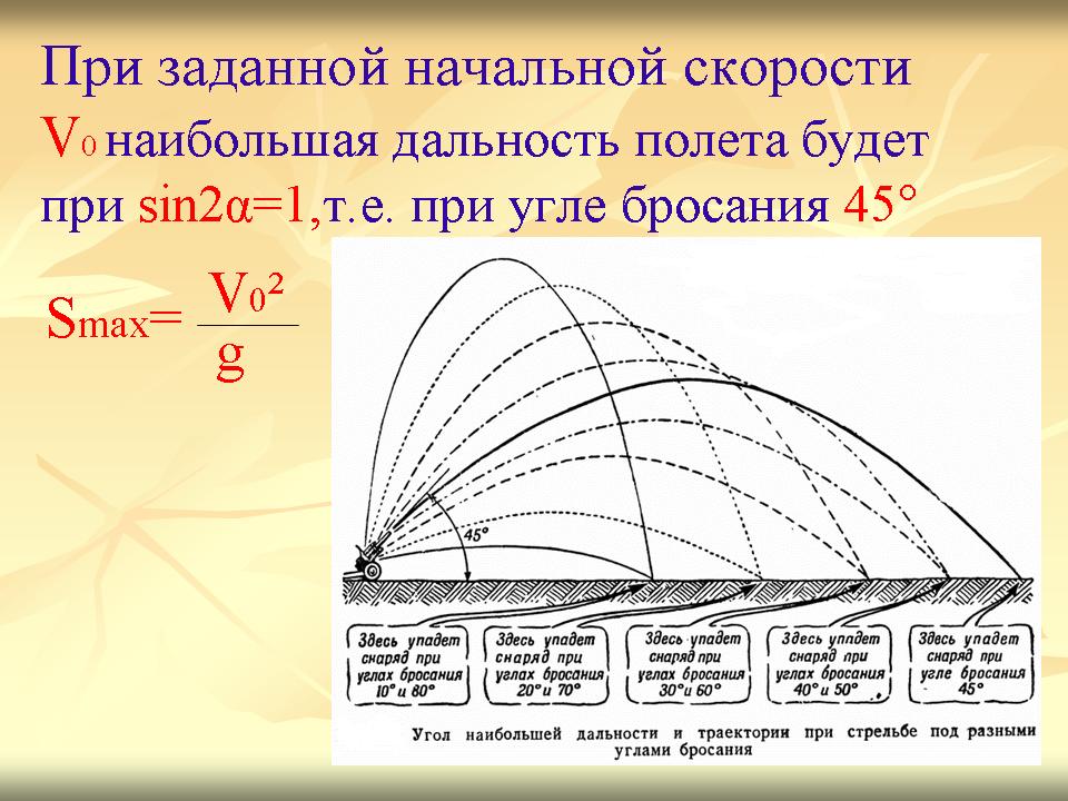 Картинка весьма теоретическая и приблизительная, даже для гаубицы. Воздух имеет сопротивление, поэтому финальная траектория будет более крутой. И даже на абсолютно ровной поверхности человек будет кидать на 2 метра выше, чем уровень земли. Поэтому для толкания ядра уже давно высчитан оптимальный угол в 37-38 градусов