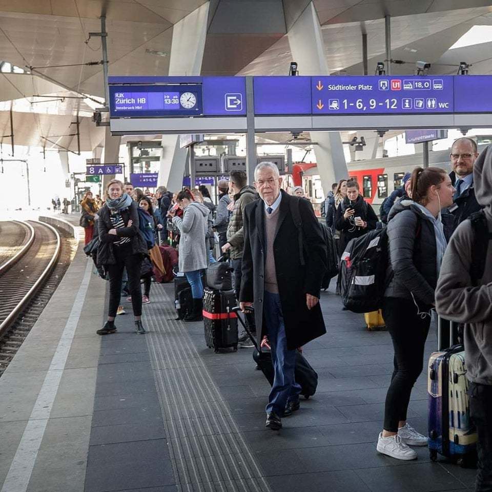 Президент Австрии Ван дер Беллен добирается на работу пешком с рюкзаком на плечах и без сопровождения охраны. При этом идет совершенно спокойно, и люди не расталкивают друг друга вокруг него, улицы не перекрывают.