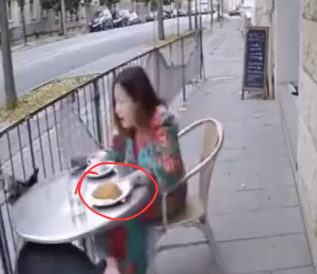Девушка кладёт руку на стол, рука скользит под тарелкой и та даже не шевелится
