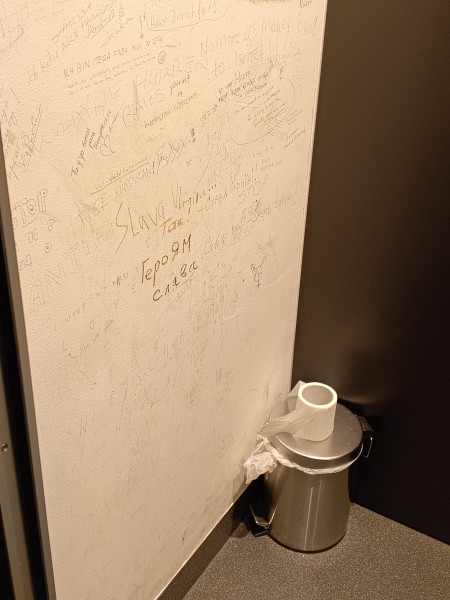 В общественном парижском туалете,есть надписи на русском языке В данном случае патриотизм вероятно украинский,правда все равно на русском. Но,в туалете венской академии художеств