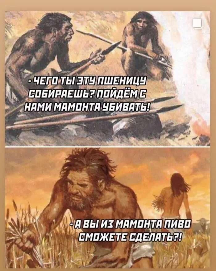 Здесь же был такой мем: первобытные мужики зовут на охоту одного, который окучивает какие-то растения, крича ему: пошли на охоту! Настоящий мужик должен есть мясо!