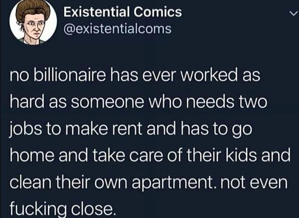 Ни один миллиардер не работал так усердно как тот кому нужно две работы чтобы оплатить аренду, а потом ещё и дома самому заботится о детях, убирать квартиру... Даже близко нет.