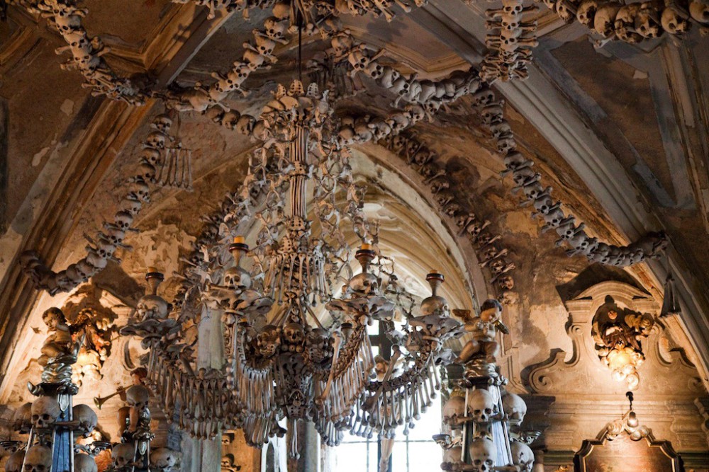 Решение он придумал феноменальное - нанял резчиков по кости и соорудил довольно крупный костел, состоящий целиком из костей. Ими же облицованный изнутри и снаружи. Мозаики с узорами из черепов, включая детские и младенческие, свисающие люстры из костей, всё такое. Типа напоминание о бренности бытия.