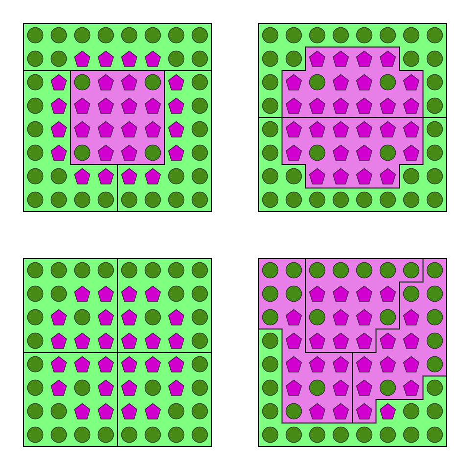 "Иллюстрация возможностей разделения на электоральные округа: хотя во всех случаях в выборах участвуют 36 зелёных и 28 фиолетовых избирателей, число доставшихся кандидатам округов может равняться как 3:1 и 4:0 (слева), так и 2:2 и даже 1:3 (справа) в зависимости от выбора разделения."