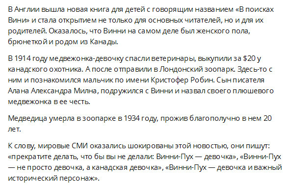 Более того, медведица Винни - ветеран Первой Мировой, где собственно от солдат она и получила добавок к имени Пух.