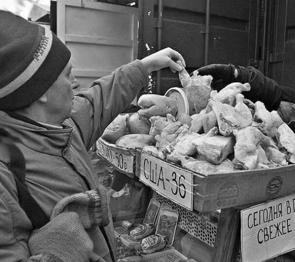 Рядом с коробкой куры от Петелино. А чем Вы питались в начале 90-х, что так уверены, что избегли встречи с окорочком? Если только не грудным молоком, конечно.