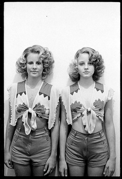 14-летняя Джоди Фостер (справа) и ее 19-летняя сестра Конни, которая играла за нее в откровенных сценах. США. 1976 г