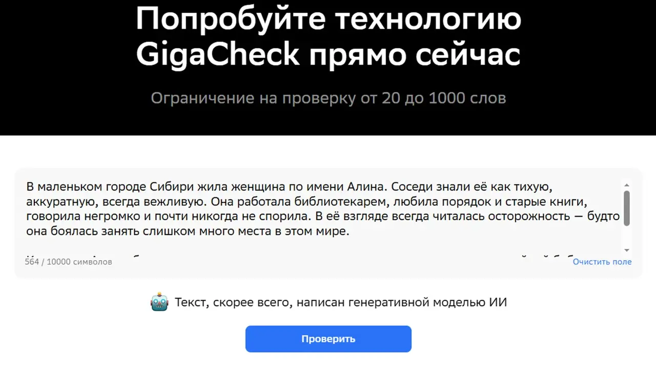 Да я сам месяцев восемь назад на этом же сайте (спасибо доброму человеку) получил ссылку на GigaCheck. С тех пор свои сомнения проверяю. Бывает редко, но ошибаюсь. Сам уже пару раз по просьбе печатал здесь ссылку для проверки подозрений. Еще раз персонально для Вас, да и для всех, кому не безразлично ИИшное графоманство: https://developers.sber.ru/portal/products/gigacheck Пусть один ИИ пристыдит другого ИИ, а заодно и посредника-пособника графоманства.
