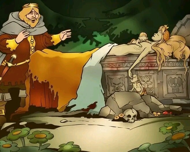 Красавица проснулась, обнаружила детей, поразмышляла и приготовилась к голодной смерти в пустом замке. Но проезжавший мимо король как раз вспомнил, что в прошлом году весьма недурственно провёл в этих зарослях время, и решил повторить мероприятие. Обнаружив детей, он повёл себя как порядочный человек: стал наведываться и подвозить продукты.