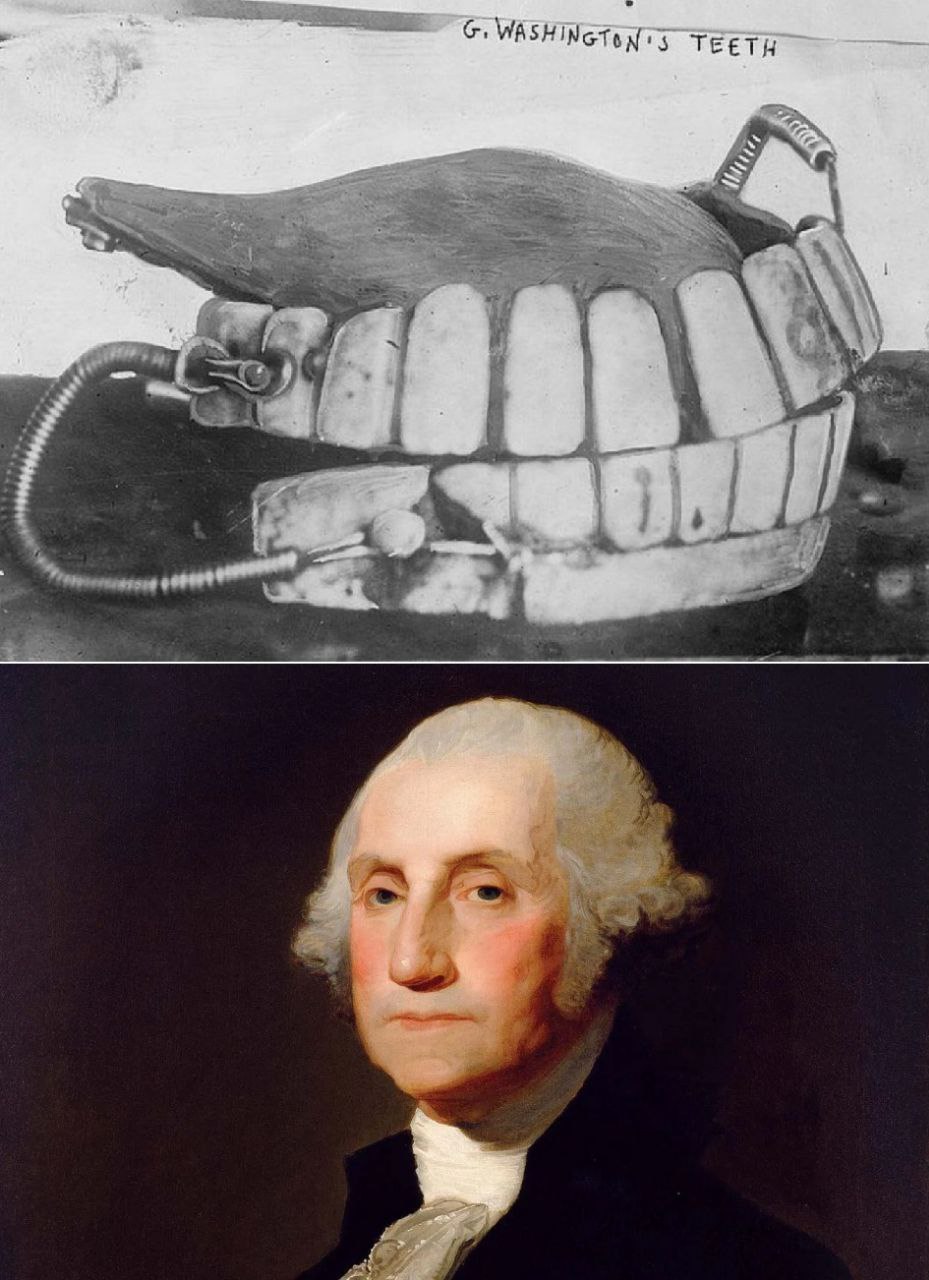 Более интересен вопрос, почему у Вашингтона выпадали зубы еще смолоду и к 57 вырван последний. Ответ очевиден - ребенок из богатой семьи, сладости были отличительной чертой зажиточных сословий. Пирожные, торты, леденцы, конфеты. Никаких зубных щеток, никаких дантистов с бормашинами. Богатые люди первыми дорвались до сладостей, первыми и поплатились. Большинство даже не успевало заметить это феномена, потому что шансы умереть до 30 от детских болезней, войн, эпидемий, родов и тысячи прочих причин вместе взятых составляли вероятно где-то 70%. А вот после 30 считалось вероятно волею Божьей, почему одни ходят щербатые или беззубые, а другие со здоровыми зубами до глубокой старости.