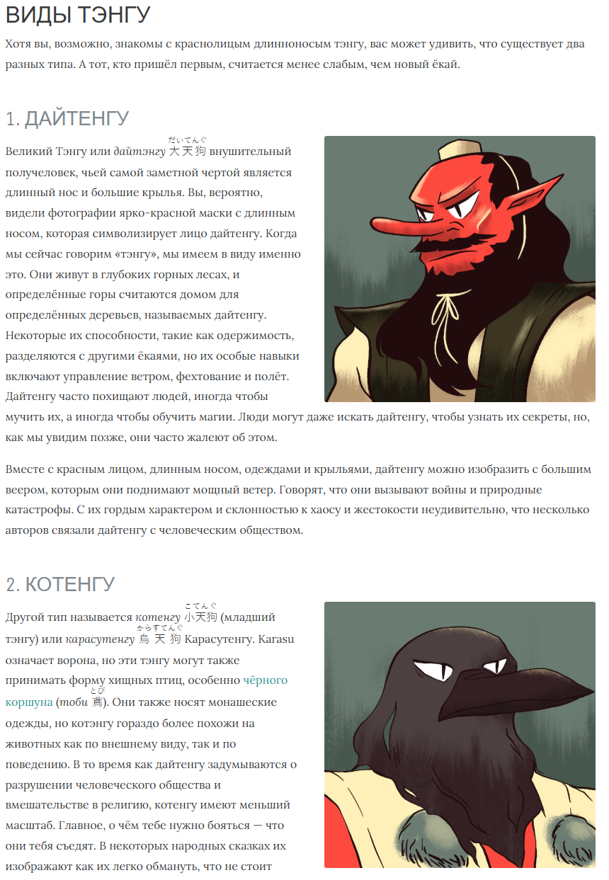 Крылатые существа, одетые как монахи-отшельники (ямабуси), с длинным носом (символ высокомерия) или как вороны (карасу-тэнгу).