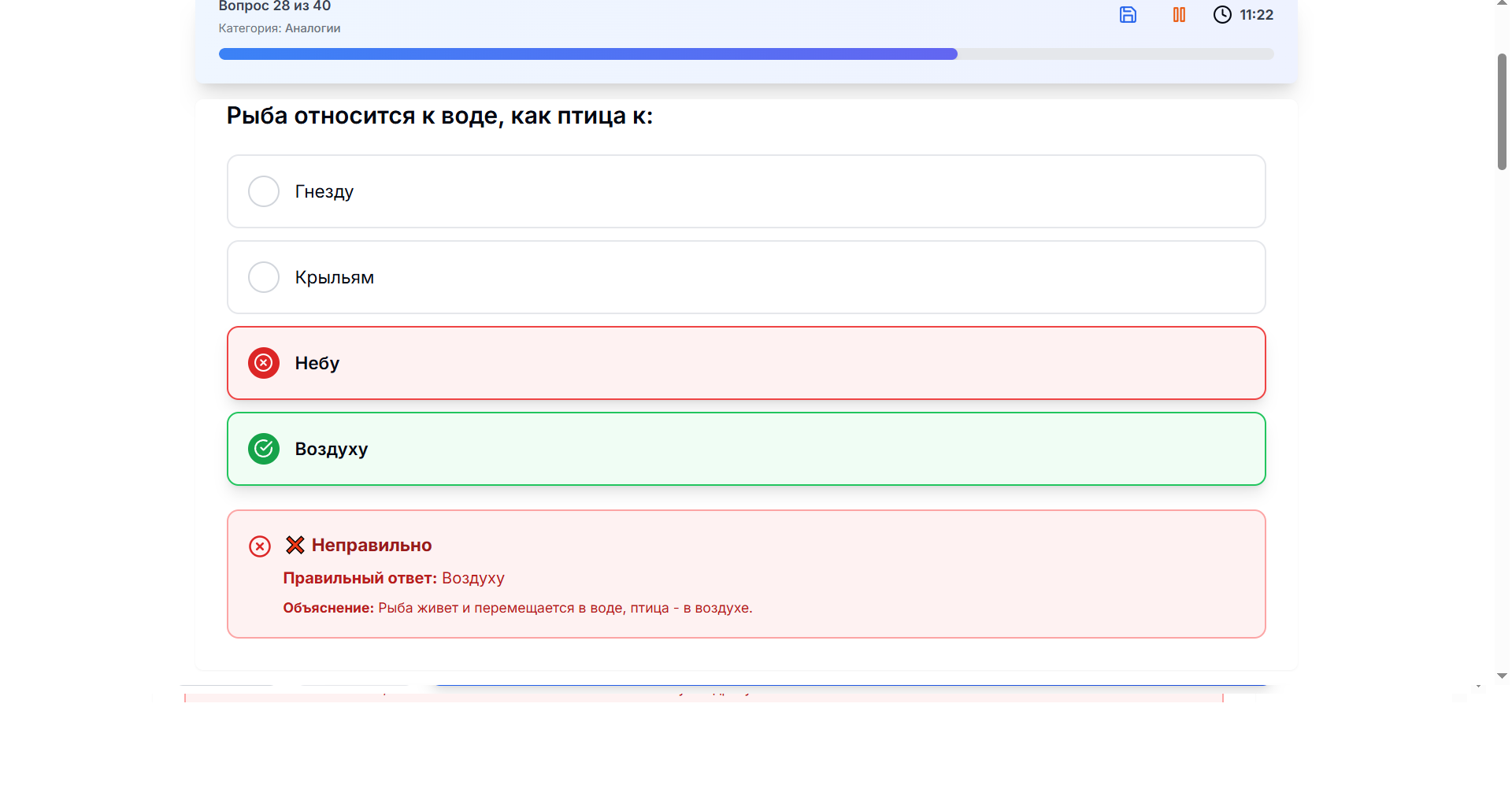 Ну вот и ладненько. Возвращаемся к вопросу - а был ли адаптирован этот самый тест к местным условиям? Что до птицы, неба и воздуха - мягко говоря, вопрос, точнее, ответы на выбор предоставлены некорректно, так как для поведения птицы что воздух, что небо - среда обитания.