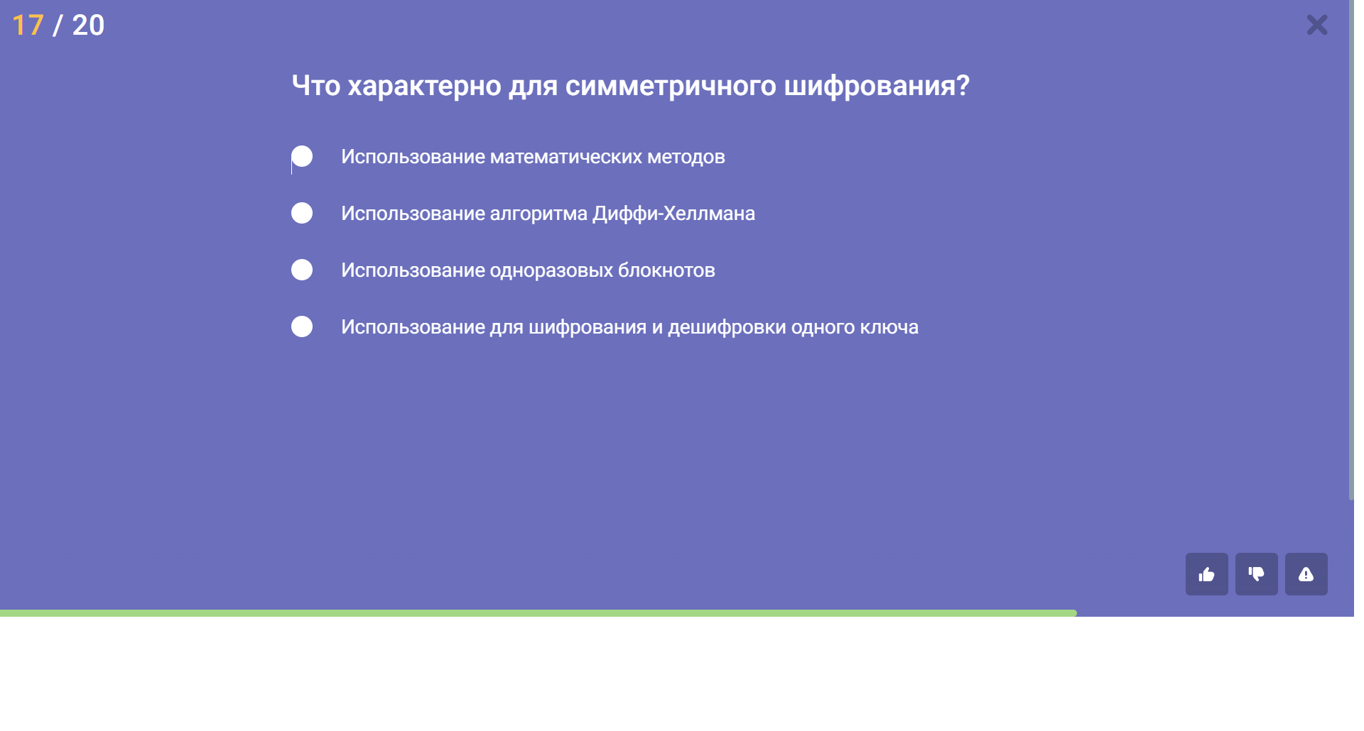 "Ваш результат по шкале "Шифры и коды": 83.33%. Вы показали 83.33% успешности в разделе, посвящённом криптографии. Этот результат отражает ваш уровень понимания основ шифрования, логики криптографических задач и методов взлома кодов. Чем выше процент, тем более уверенно вы ориентируетесь в принципах защиты информации.