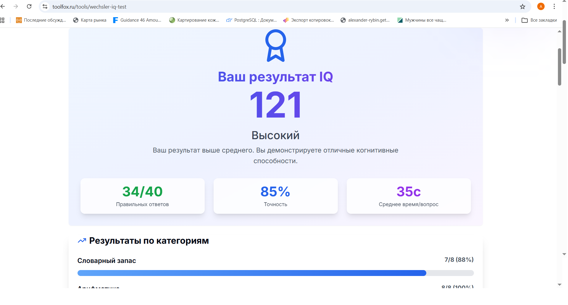 Ради интереса сейчас тыркнула в первый попавшийся IQ-тест в интернете. В общем, результат 115 баллов, но часть ответов я дала "методом научного тыка". Не уверена, что этот результат верно отображает мой IQ.