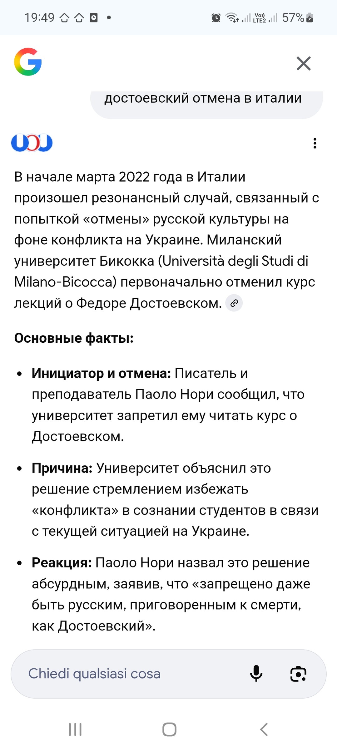 Сейчас ситуация нормализовалась, агрессии со стороны итальянцев нет, но Чайковский и Достоевский до сих пор под запретом. Но это уже большая политика, а не отношения между людьми.