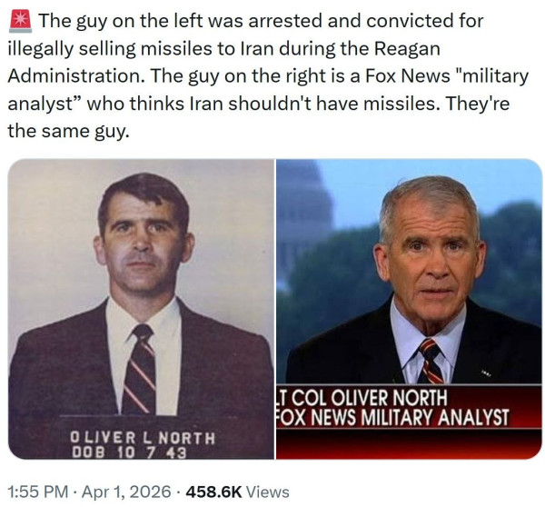 Слева человек, который был арестован и осужден за незаконную продажу оружия Ирану во времена администрации Рональда Рейгана (скандал «Иран-контрас» начала 80-х). А справа военный эксперт телеканала Fox News, который отказывает Ирану в праве иметь ракетное оружие. Это один и тот же человек, его зовут Оливер Норт.