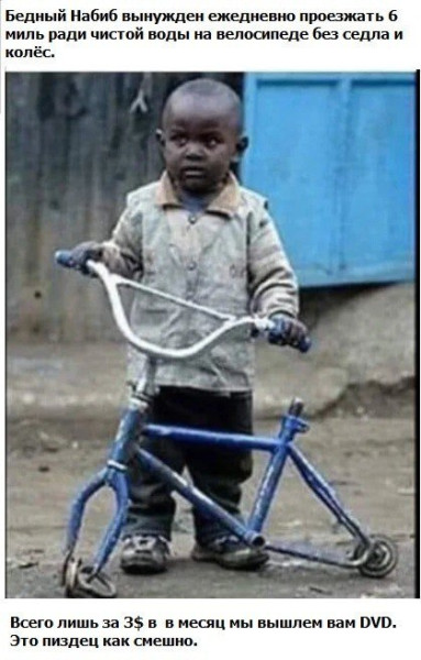 Можно пояснительную бригаду? Кому вам? Что за DVD? Как можно ехать без колес? Если он бежит, держа раму между ногами, нахер ему рама? В каком веке, как вам кажется, вы живете, если думаете, что нас это должно растрогать или вызвать праведный гнев? Ну и да, вы ведь в курсе, что намеки на детскую порнографию это не просто не смешно, а статья?
