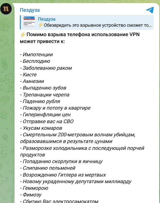 Эксперт разъяснил, что использование VPN может привести к взрыву смартфона. А длительное использование VPN может привести к поносу, недержанию мочи, а также к импотенции и слабоумию.