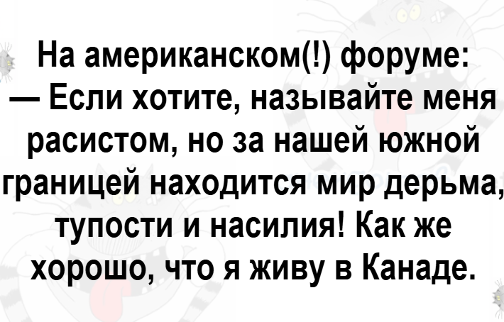 Которые сидя в условной Канаде, указывают как нам тут жить. А на попытки возразить со ссылкой на опыт других государств - уверенно отрезают, что надо заниматься делами страны в которой живёшь сам, и не лезть в чужие :D