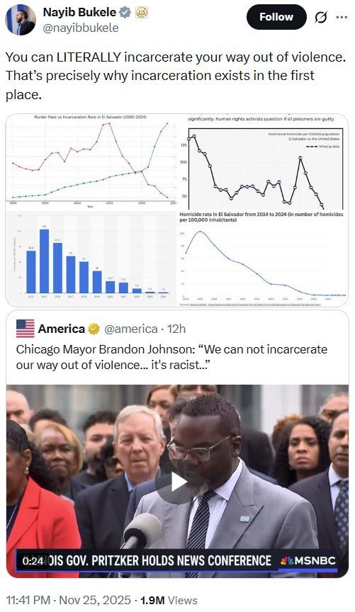 Самый популярный политик мира отчитался (https://x.com/nayibbukele/status/1993419780108550293) о проделанной работе.