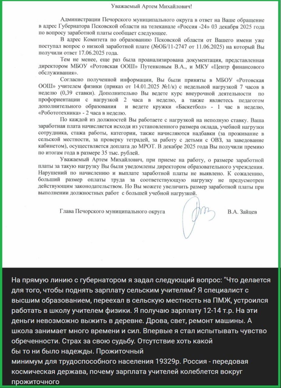 Такой совет преподаватель физики из Псковской области Артём Лапин получил от главы Печорского района Валерия Зайцева. На прямой линии губернатора он пожаловался на маленькую зарплату в 12-14 тысяч рублей при большой нагрузке — помимо уроков физики, учитель ведёт кружки по баскетболу, робототехнике и профориентации, заведует кабинетом, работает с детьми с ограниченными возможностями. Ответа от правительства региона он не дождался, а местный чиновник напомнил Лапину о годовой премии в 35 тысяч рублей: «Нарушений не выявлено. К сожалению, больший размер оплаты труда за соответствующую нагрузку не предусмотрен