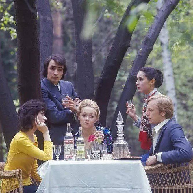 На фото - реклама экспортной водки «Столичная» для внешнеторгового объединения «Союзплодимпорт», 1973 г. Крайний справа – 26-летний артист театра «Современник» Юрий Богатырев. Блондинка в центре – 26-летняя манекенщица Всесоюзного дома моделей на Кузнецком мосту Татьяна Шигаева, в том же году она выйдет замуж за кинорежиссера Никиту Михалкова. Фотограф – Валерий Плотников. Место съемки – Переделкино, дача писателя Льва Кассиля. Писатель умер в 1970-м, дачу унаследовала его дочь Ирина Собинова-Кассиль. На снимке она крайняя слева. Графин и рюмки на столе - старинные, из них пили еще Лев Кассиль и его жена Светлана Собинова, а может быть и тесть Кассиля, великий певец Леонид Собинов. Прислонился к дереву актер МХАТа Юрий Меншагин. Справа манекенщица Наталья Готовцева (будущая жена сценариста В. Ежова автора фильма «Баллада о солдате»).