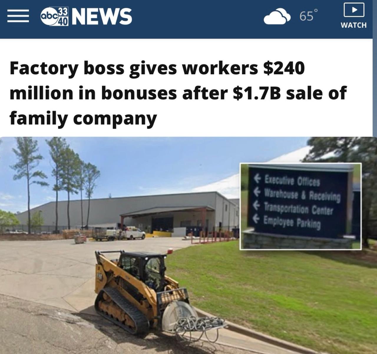 В США владелец фабрики раздал работникам 240 млн долларов бонусов после продажи компании. Сотрудники закрыли свои кредиты, купили дома и оплатили обучение детям.