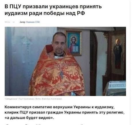 Так называемый священник из ПЦУ Василий Косяченко… призвал граждан Украины принять иудаизм, поскольку симпатии к этой религии проявляют первые лица государства, и она может объединить страну и победить РФ.