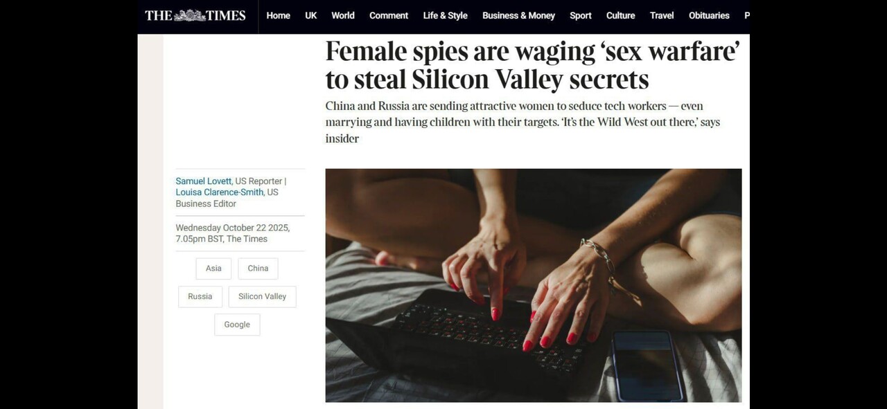 По данным издания, привлекательных россиянок и китаянок начали массово отправлять в Кремниевую долину. Контрразведка США опасается за технологическую безопасность страны, так как девушки выходят замуж и даже рожают детей перспективным американским ученым с целью шпионажа.