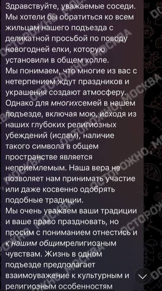 Но в российской действительности роль Гринча иногда неожиданно исполняет… новогодняя ёлка в подъезде. Именно так произошло в одном доме, где украшенное дерево вызвало искреннее недоумение и дискомфорт у жильцов-мусульман. В домашнем чате они вежливо попросили убрать ёлку — и получили в ответ резкий, категоричный отказ.