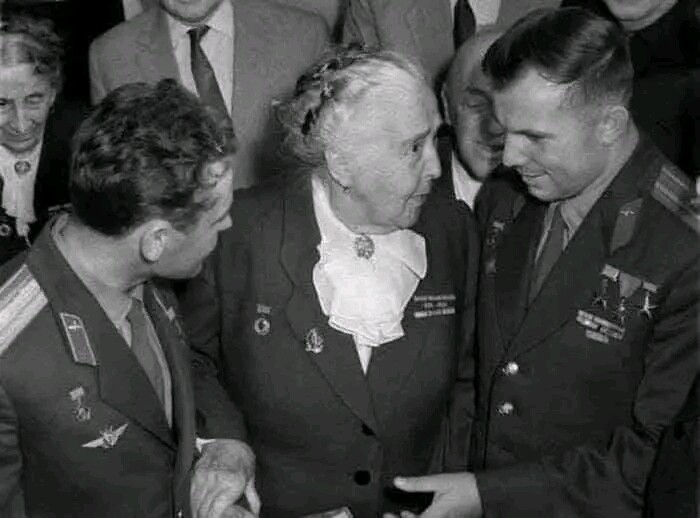 ...А незадолго до окончания театральной карьеры актрису привели в качестве "свадебного генерала" на банкет по случаю чествования Юрия Гагарина и Германа Титова. Космонавтов подвели к Яблочкиной, представили: "Александра Александровна, познакомьтесь, это наши первые космонавты - Юрий Алексеевич Гагарин и Герман Степанович Титов". Гагарин и Титов поцеловали руку Яблочкиной, та потрепала обоих по щеке, поцеловала в висок. Через некоторое время началось застолье. И вот в какой-то момент, когда шум чуть-чуть стих, все услышали хорошо поставленный голос Яблочкиной: "Но мне так и не сказали, в каком полку служат эти молоденькие поручики!"