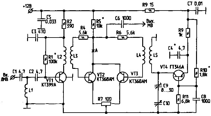 В качестве изделия преподаватель согласовал мне телевизионный конвертер ДМВ-МВ. Необычайно нужное устройство в конце 80-х - что бы смотреть новые дециметровые каналы на старых ламповых телевизорах. Сам конвертер сделал и настроил довольно быстро. Делов-то - нашел схему, нарисовал разводку на фольгированном текстолите, просверлил дырочки под радиодетали, протравил в хлорном железе. Покрыть оловом получившиеся дорожки и припаять несколько деталей - это вообще работы на 15 минут.