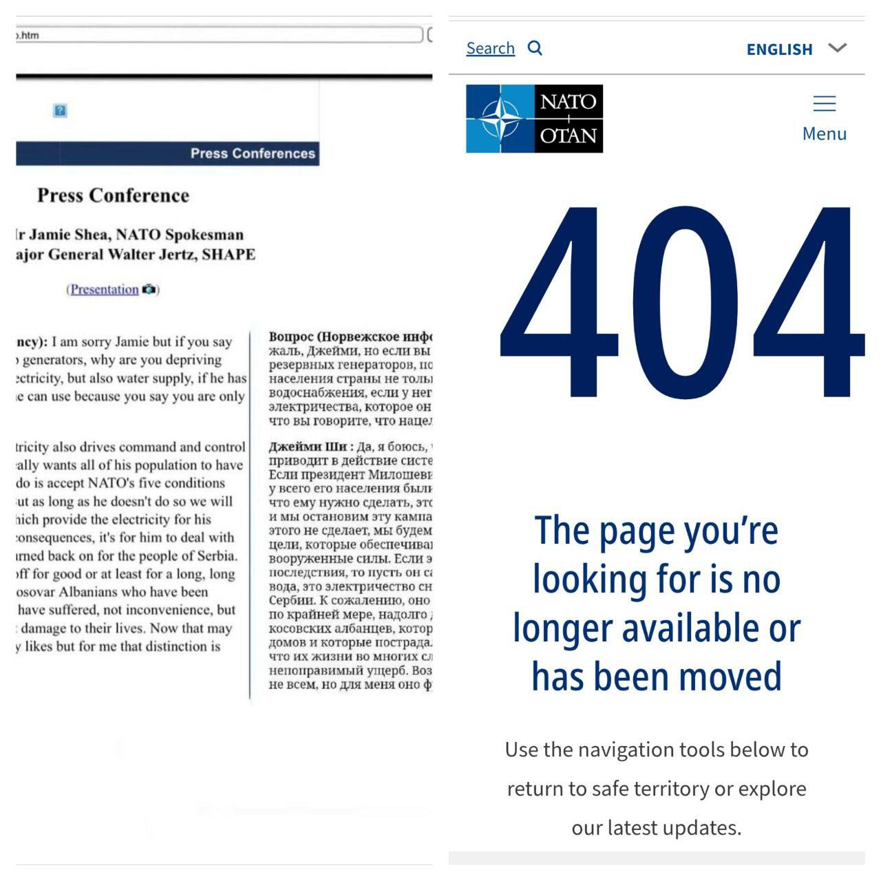 Стенограмма пресс-брифинга НАТО от 25 мая 1999 года, на котором пресс-секретарь альянса Джейми Ши оправдывал удары по гражданской инфраструктуре Сербии, была удалена с официального сайта организации.