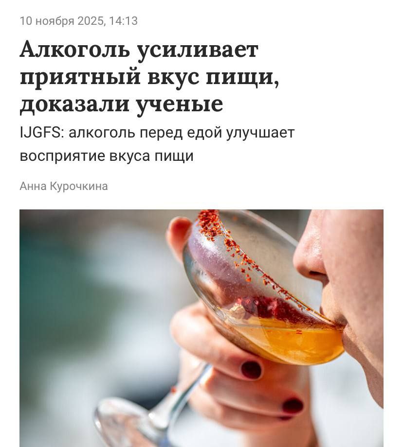 Они установили, что любой алкогольный напиток перед приёмом пищи не только улучшает её вкус, но и усиливает удовольствие от неё.