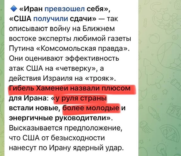 Если у вас получилось ликвидировать всю верхушку Ирана - это на самом деле его победа. Дело в том, что старые руководители были мягкие, умеренные, да и прямо скажем, не очень компетентные, да вообще фигня какая-то! Но раз вы их безрассудно убрали, то им на смену придут, во-первых, сверхкомпетентные, которые до того таились в тени, а теперь настал их час. А во-вторых, особо злобные и непримиримые. Кто? (попросите ИИ найти один пример, если не получится, просто махните рукой)